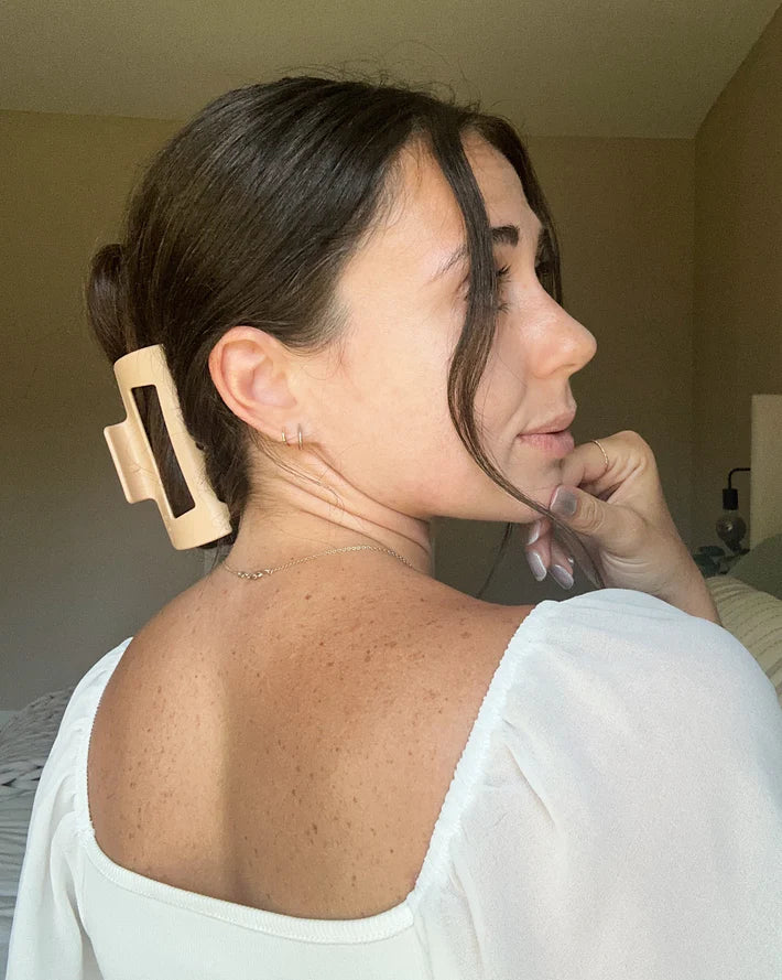 We tested 22 prototypes to achieve the ideal balance between hold and softness . Every detail was calibrated, even the compression angle , to embrace the hair securely without ever squeezing . Inside the Soft Clip is a stainless steel spring designed to withstand time , humidity , and daily use . The result? A stable hold for over 8 hours , without slipping or breaking, invisible where it counts.